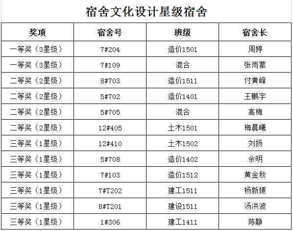 公司于4月初至5月中旬,历时一个多月的时间开展了“宿舍文化设计大赛”活动。通过宣传动员、组织实施、评比表彰等三个阶段的组织实施,评出宿舍文化设计星级宿舍12间。(具体星级见附表)