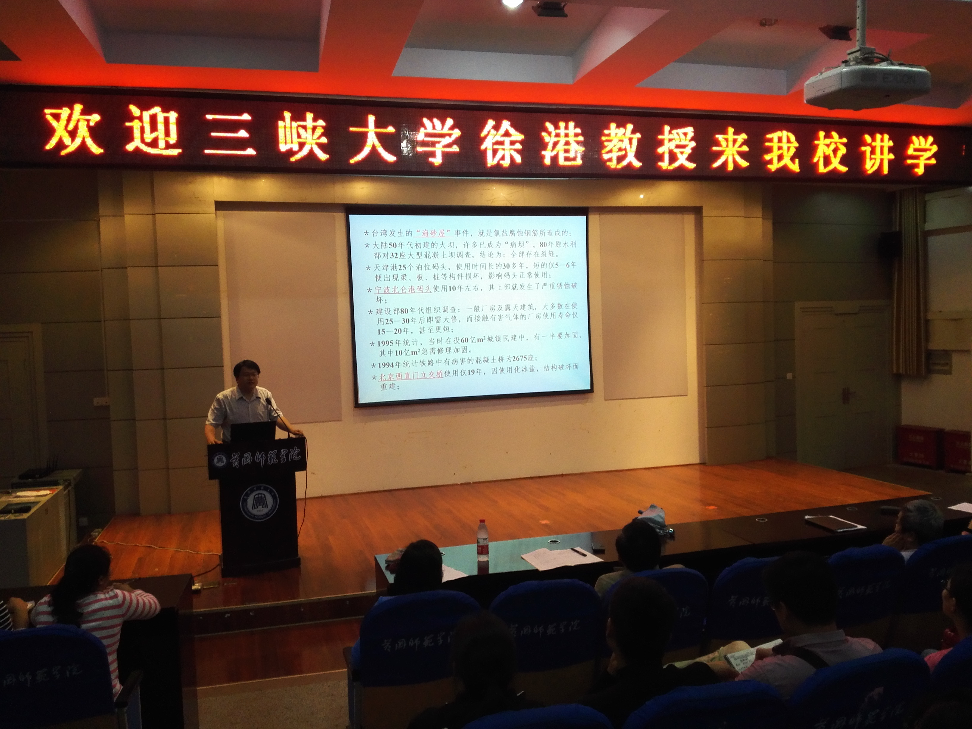 5月20日晚上,三峡大学硕士生导师徐港教授应邀来公司举办题为“氯盐环境下钢筋混凝土结构耐久性研究”的专题讲座。公司全体教师及员工200余人倾听了徐教授的精彩讲座。
