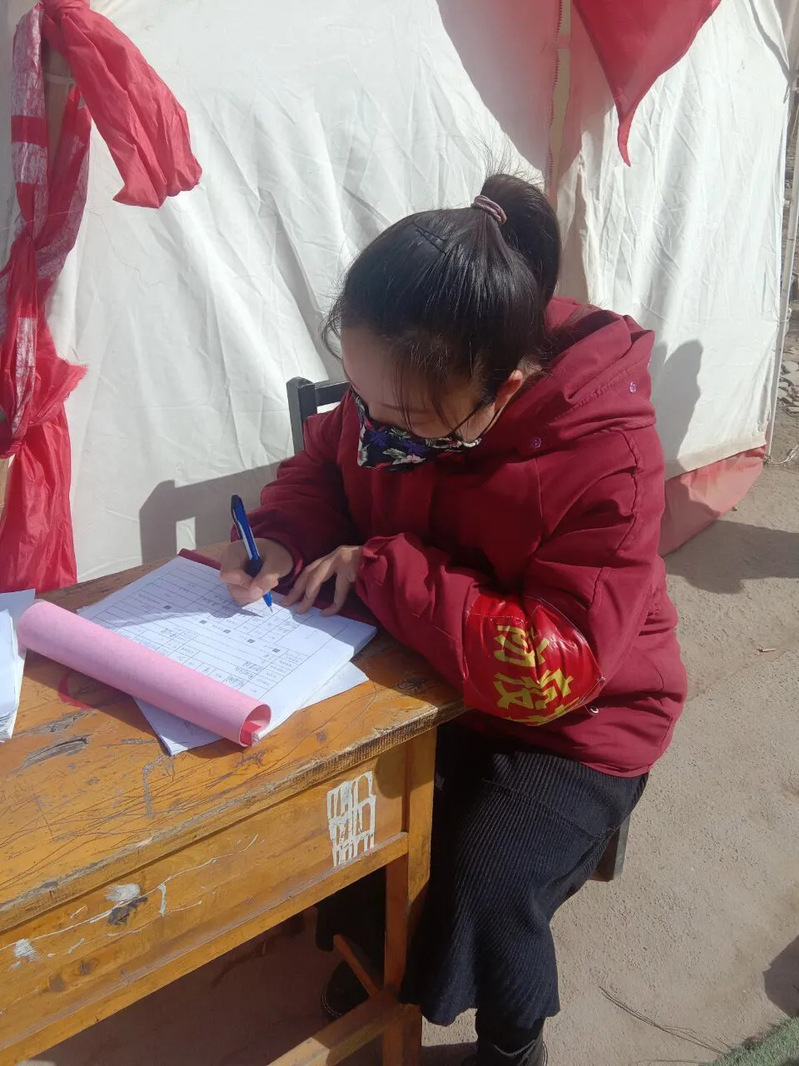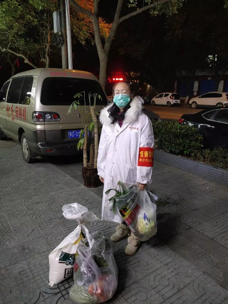 建设1801班辛丹丹,担任抗疫志愿者期间,询问各户身体状况、测量体温、宣传疫情防控政策,帮居民采购物资。