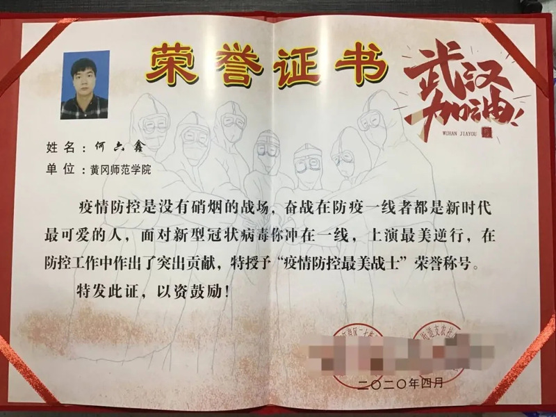 土木1904班何六鑫,报名参与社区组织的防疫工作,对社区进出居民进行消毒、人员防控以及体温检测。在墙上张贴社区团购的微信群等,组织居民有序排队。被授予“疫情防控最美战士”荣誉称号。