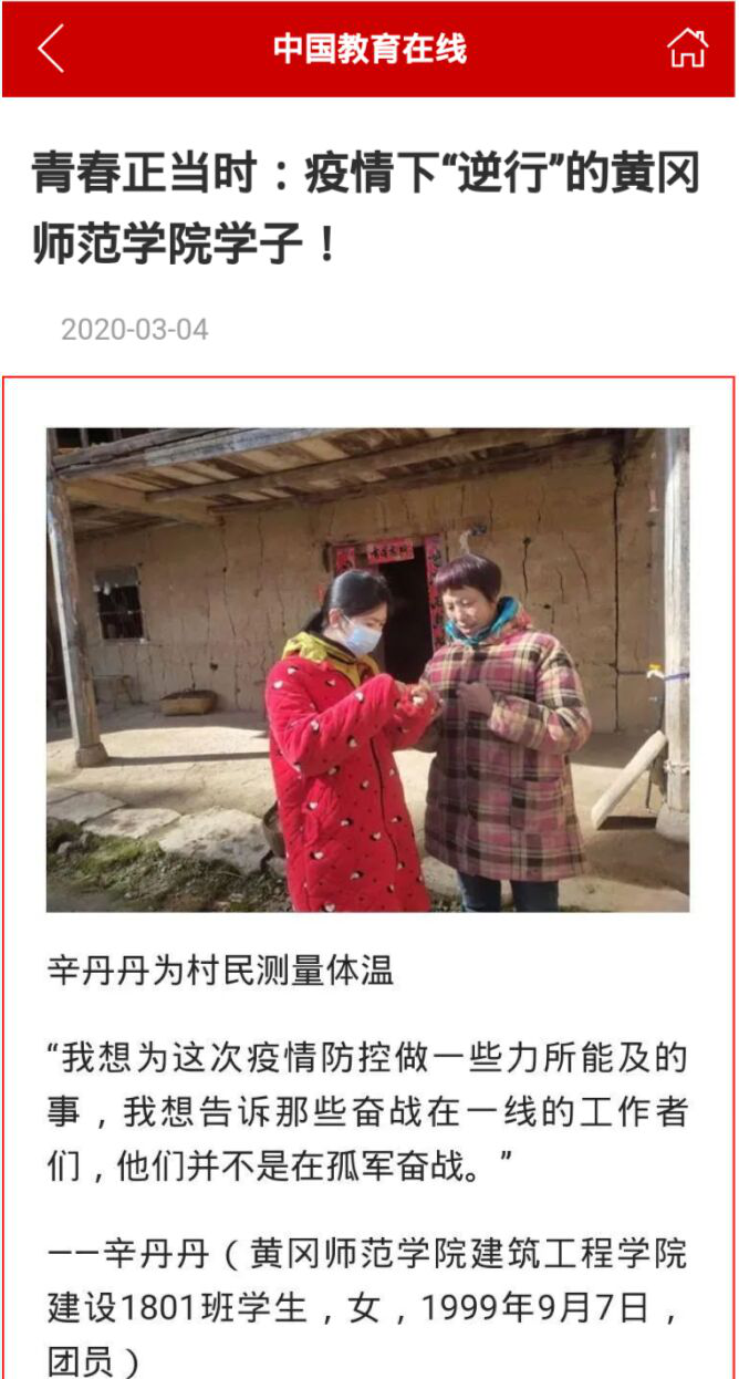 土木1903班江建兵,每天负责登记受疫情况影响采集表和为出行村民开具出行证明,每天最早来到村委会进行消杀工作。不定时到村民家中宣传和测量体温。主动为武汉捐款。