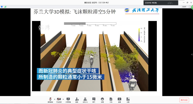 明廷臻教授以此次新冠病毒疫情为研究背景,作了题为“病毒传播机理及通风防控技术”的学术报告。他从新冠病毒的传播方式、传播成因以及不同类型建筑环境中的病毒传播路径等三个方面进行了客观分析,结合仿真模拟视频直观生动地展示了病毒传播的全过程及应该采取的防控措施。