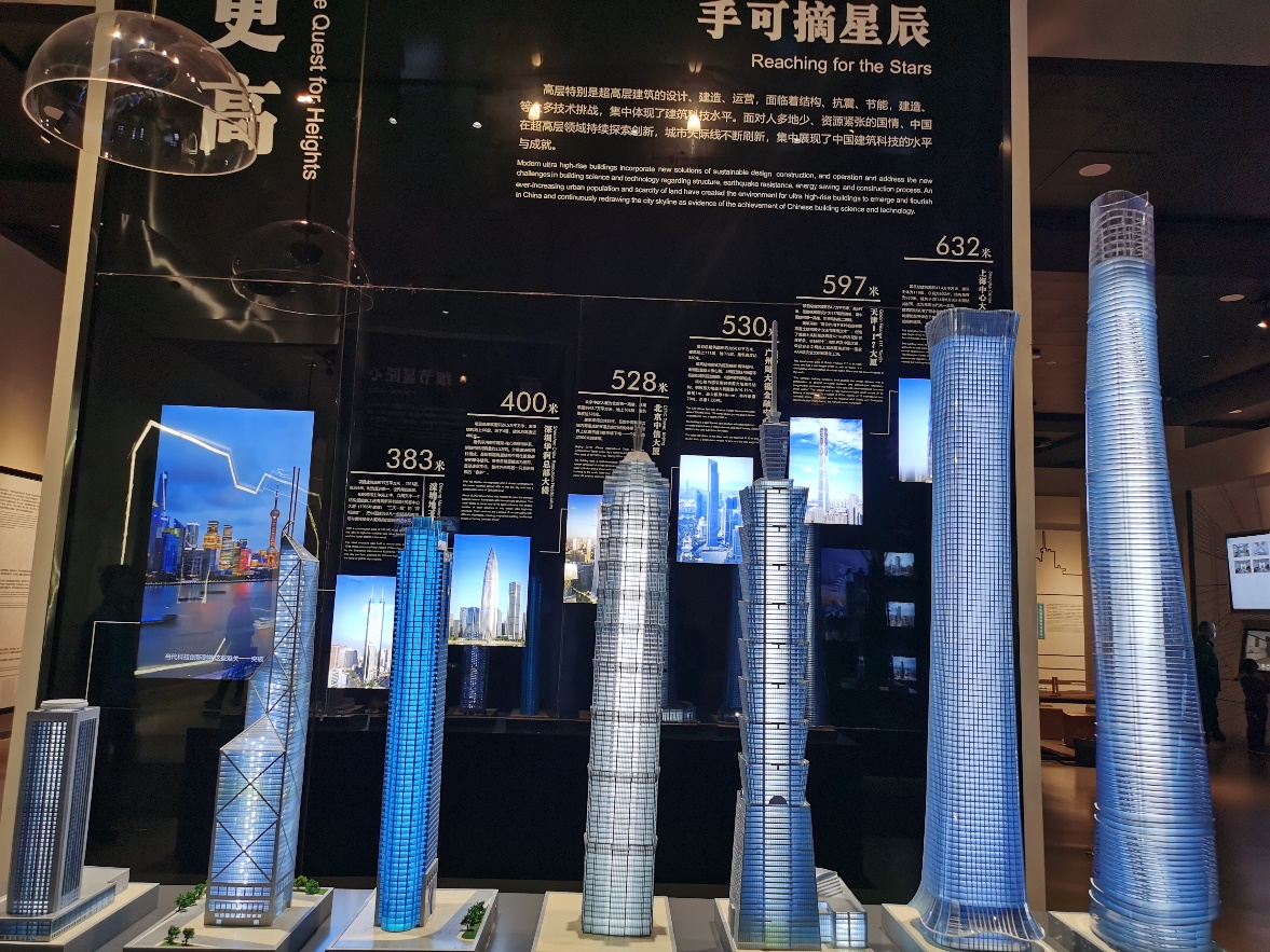 中国建筑科技馆地下三层是常设展厅,分为古代建筑、现代建筑、未来建筑、荆楚建筑四大展厅,全面展现中国古代建筑文化、现代建筑科技、未来建筑展望、荆楚建筑成就,借助许多高科技手段,呈现中国几千年来的建筑文化发展历程。同学们步入古代建筑展厅,亲自体验古人智慧——能抵抗10级地震顶天立地的斗拱榫卯结构、防水防潮极尽奢华的琉璃瓦当。唐代最大的木结构建筑,被著名建筑师梁思成先生誉为“中国建筑第一瑰宝”——五台山佛光寺东大殿,现存世界上最古老、最高的全木结构高层塔——应县木塔,以及北京故宫太和殿、嵩岳寺塔等古代建筑的复原模型。现代建筑展厅表现的是现代中国不同时期的高层建筑,从1985年建成高383米的深圳地王大厦,到2016年高632米的中国第一高楼——上海中心大厦,这代表的不仅是数字的飞跃,更展现了中国建筑科技水平不断发展的成就。荆楚建筑展厅陈列着荆楚大地许多地标建筑的模型,比如江汉关大楼、古德寺、汉口租界的核心建筑,还通过全息影像技术,立体还原了武汉剧院、武汉火车站、天河机场、绿地中心等共9座荆楚经典建筑。未来建筑展厅,四周陈列着一些未来建筑理念模型,水下住宅、垂直城市、行走之城、5G时代的智慧城市......,充分展示了设计师们天马行空的想象力。