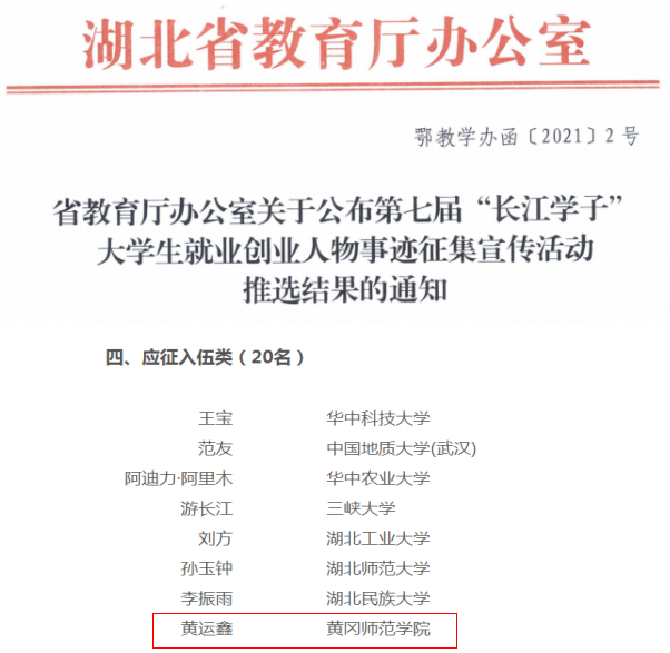 “长江学子”老员工就业创业人物事迹征集结果,william威廉英国官网造价201901班黄运鑫从众多参选者中脱颖而出,获评第七届“长江学子”老员工“应征入伍类”典型人物,充分展现了黄师学子爱党爱国,勇于创新创业,敢于到基层、军队和祖国最需要的地方建功立业的精神风貌,深刻诠释了“尚师表、勇担当、秉诚朴、图自强” 的黄师精神。