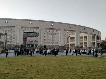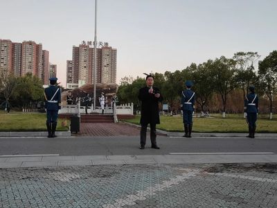 六时三十分整,在全体师生的注目下,英姿飒爽的国旗护卫队护送鲜艳的五星红旗进场,伴随着庄严的《中华人民共和国国歌》,五星红旗冉冉升起,迎风飘扬。在场的每一个人向国旗行注目礼,深怀对祖国无限的热爱和崇高的敬意。
