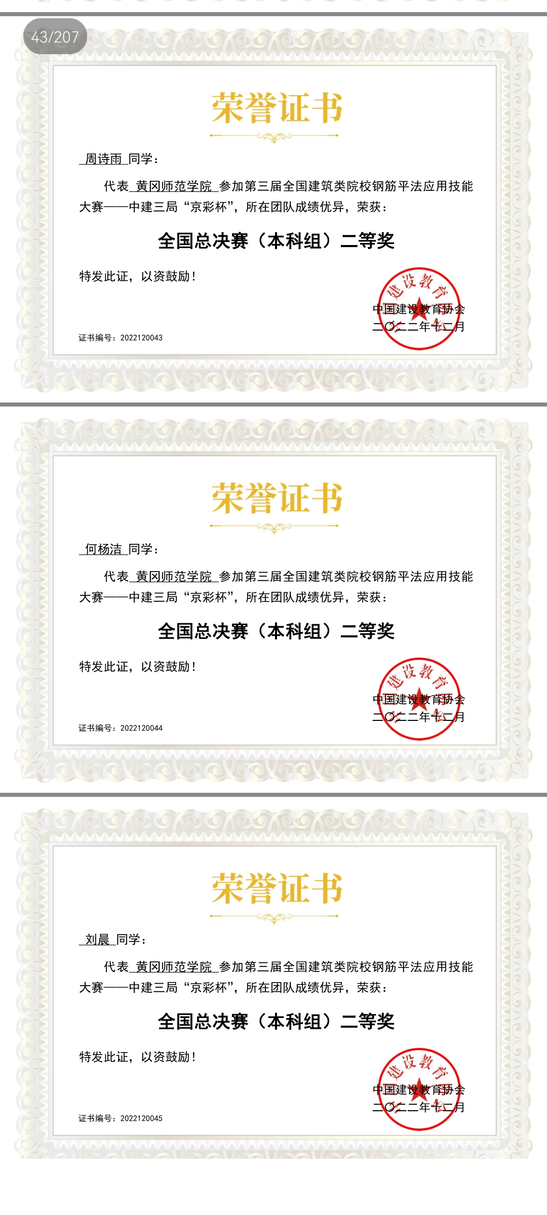 近日,公司学子参加由中国建设教育协会举办的第三届全国建筑类院校钢筋平法应用技能大赛-中建三局“京彩杯”全国总决赛,获得本科组团体奖二等奖和三等奖各一项、单项奖共6项的佳绩。