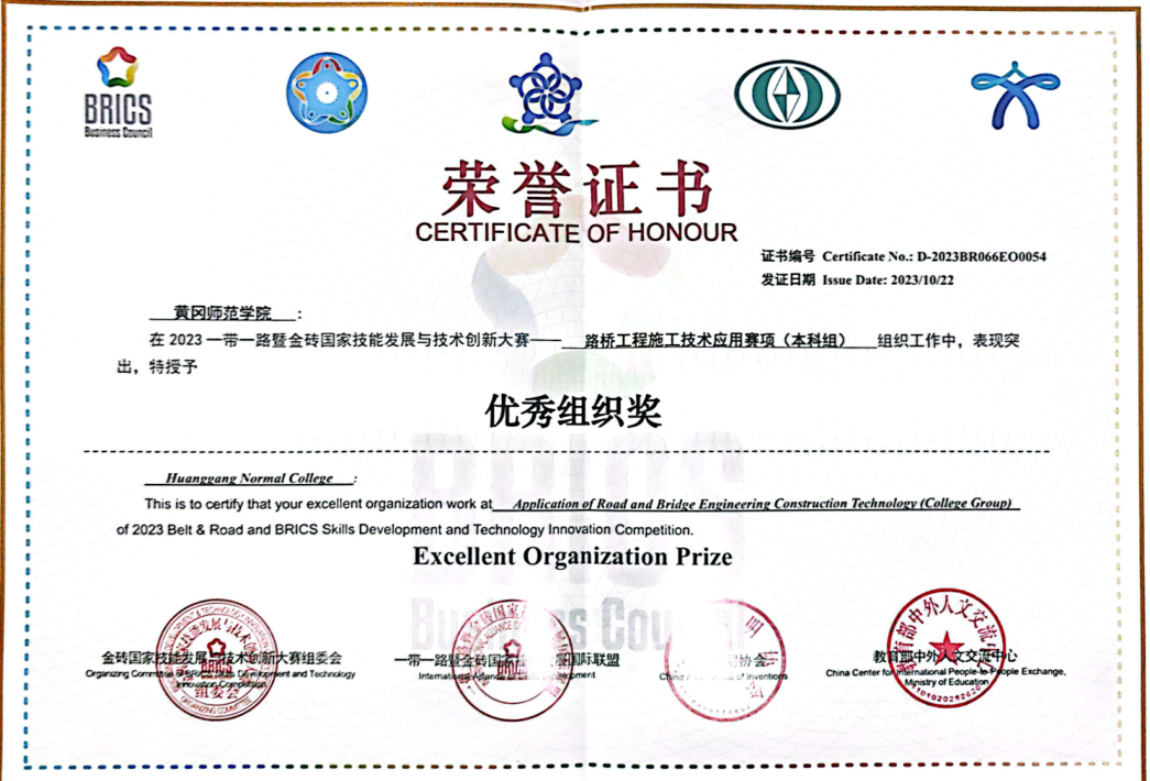 金砖国家技能发展与技术创新大赛是2017年金砖国家最高领导人会晤筹备委员会认可、经中华人民共和国外交部备案、金砖国家工商理事会批准的国际大赛。2023第七届一带一路暨金砖国家技能发展与技术创新大赛路桥工程施工技术应用技能竞赛共有来自全国28个省(区)、79所本科院校、153支代表队参加了本场决赛。大赛共设置一等奖8项,二等奖15项,三等奖30项,优秀奖40项。大赛重点考查员工道路与桥梁的专业理论知识掌握程度以及道路与桥梁工程施工工艺模拟实操能力。