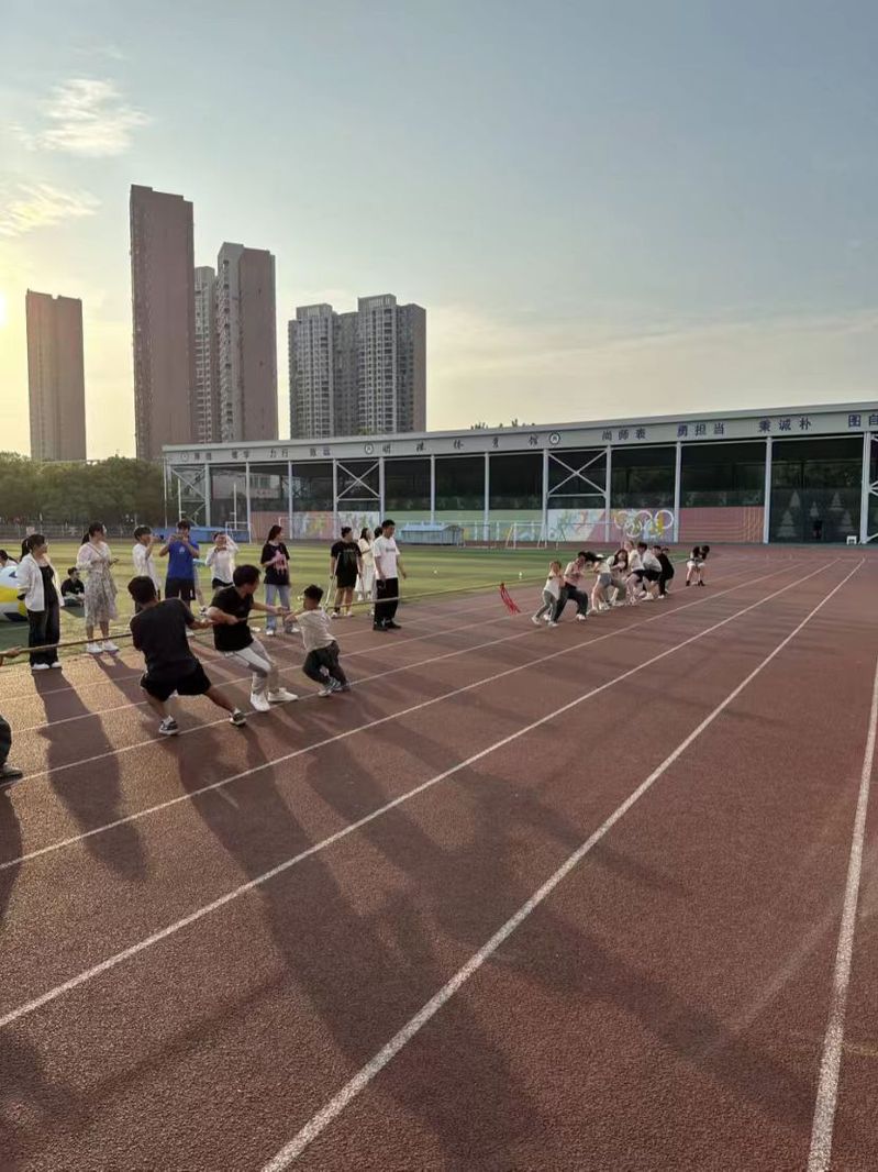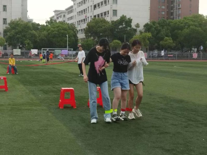 运动场上,每一位同学笑容满面,精力充沛。趣味比赛设“三人四足”、“抢凳子”、“巨型排球”、“拔河”、“踩气球”、“画地为牢”等几个项目。